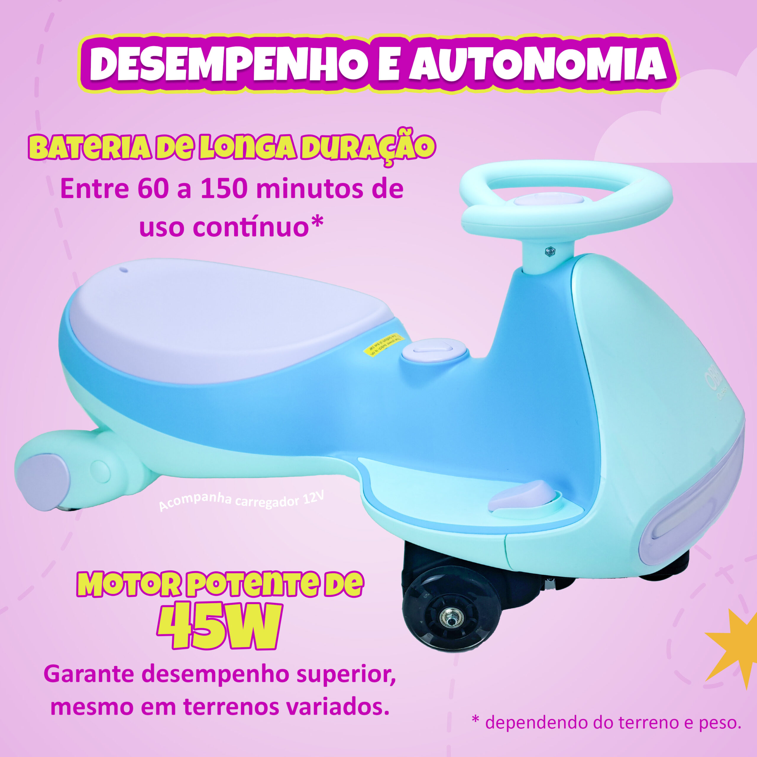 Motor: Potente motor de 45W com tração dianteira